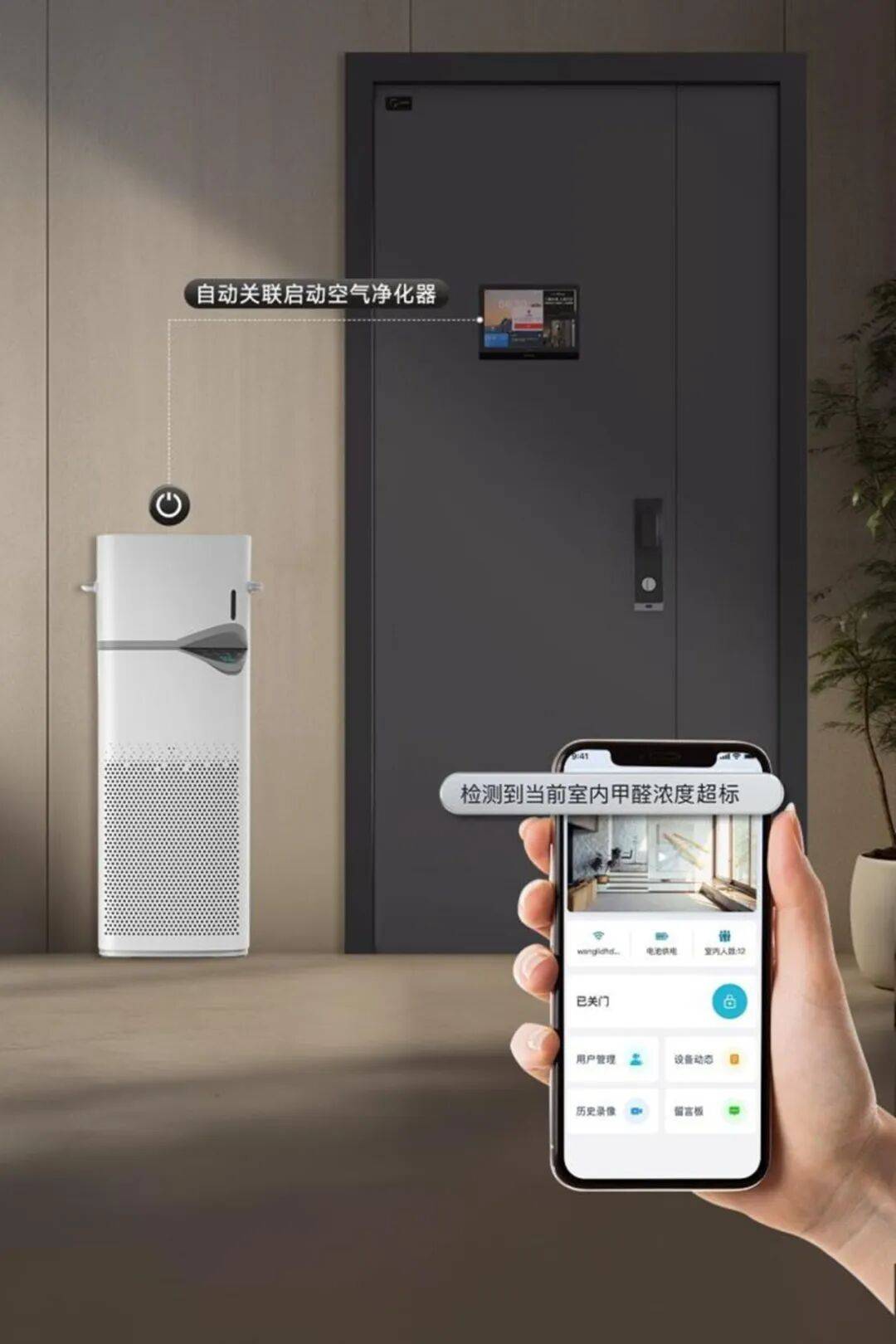 为了解决这一困扰万千家庭的健康隐患,王力安防历时两年多研发研发出“甲醛哨兵监测技术”,率先将高精度、全天候的甲醛监测功能融入防盗门中,让防盗门从物理屏障变身健康卫士,精准填补了行业空白。该技术可实现24小时持续监测,覆盖甲醛、PM2.5、温湿度等关键环境指标,精准匹配安全标准。当甲醛浓度>0.08mg/m³或者PM2.5>75μg/m³ 时,门体智能大屏与手机APP将会同步发出警报提示用户,关注风险信号。并能联动全屋新风系统、爱感空气净化器和王力智能窗,真正实现“监测+治理“的健康防护闭环。
