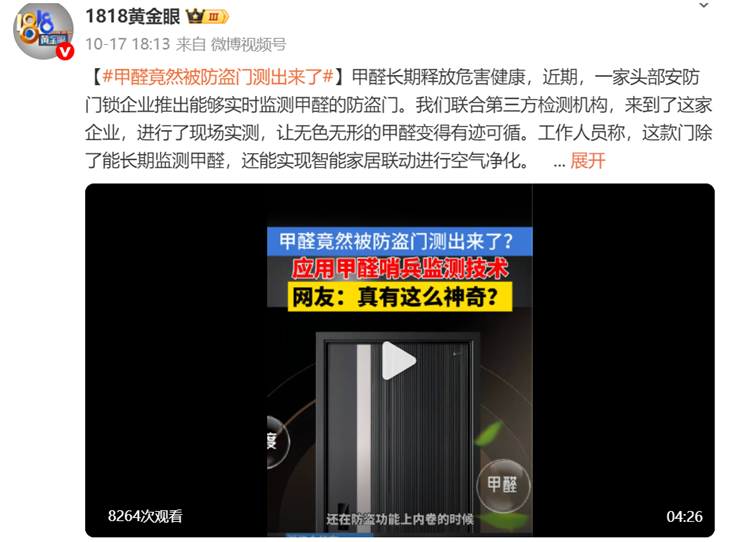 近日,一款具备甲醛监测功能的防盗门引发了网友热议,不少网友留言表示:“第一次见能测甲醛的防盗门,是真的吗?”“哪款防盗门?我家房子刚装好很需要”。