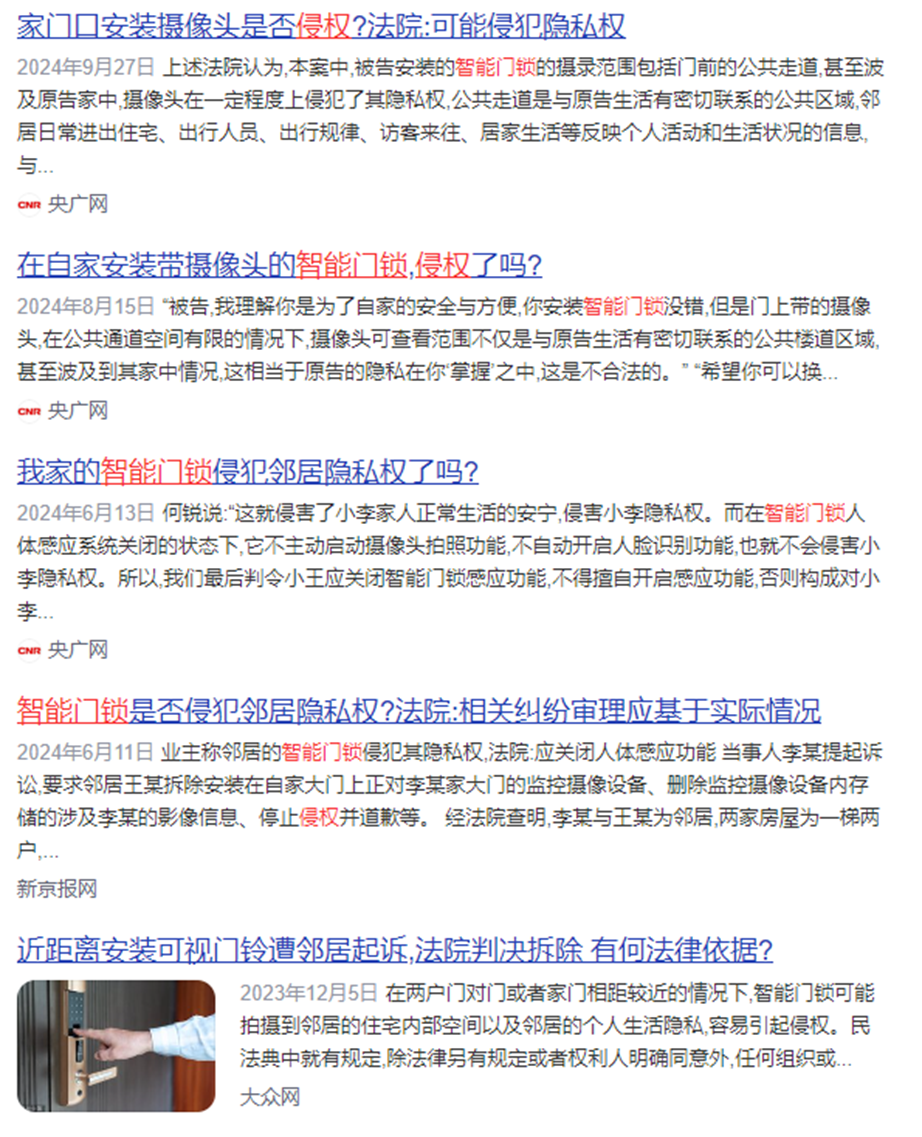 在网络平台搜索“智能门锁侵权”等关键词可以发现,全国范围内因为智能门锁引发的邻里纠纷乃至法律诉讼的新闻早已屡见不鲜。北京市第一中级人民法院公布的一批《民法典》典型案件中,其中便将智能门锁摄像头涉嫌侵犯邻居隐私的案件作为典型案例收录其中。既体现了司法机构对这类新型侵权纠纷的高度重视,也说明此类案件已具备一定普遍性。值得注意的是,在多数类似判决中,法院均要求用户关闭监控功能或直接拆除设备,与博主视频中的结果一致。
